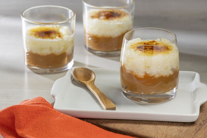 2 – Sobre o creme de tapioca, espalhe 5 gramas de açúcar uniformemente, use um maçarico para gratinar. Cuidado para não queimar demais o açúcar.