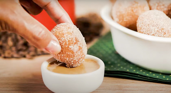 Em uma vasilha, misture todos os ingredientes da receita, menos o fermento. Após misturar tudo, acrescente o fermento e mexa mais um pouco. Em óleo quente, frite os bolinhos com o auxílio de uma colher. Quando bem frito, tire do óleo, escorra e passe no açúcar misturado com a canela. Em seguida, sirva com o doce de leite cremoso.