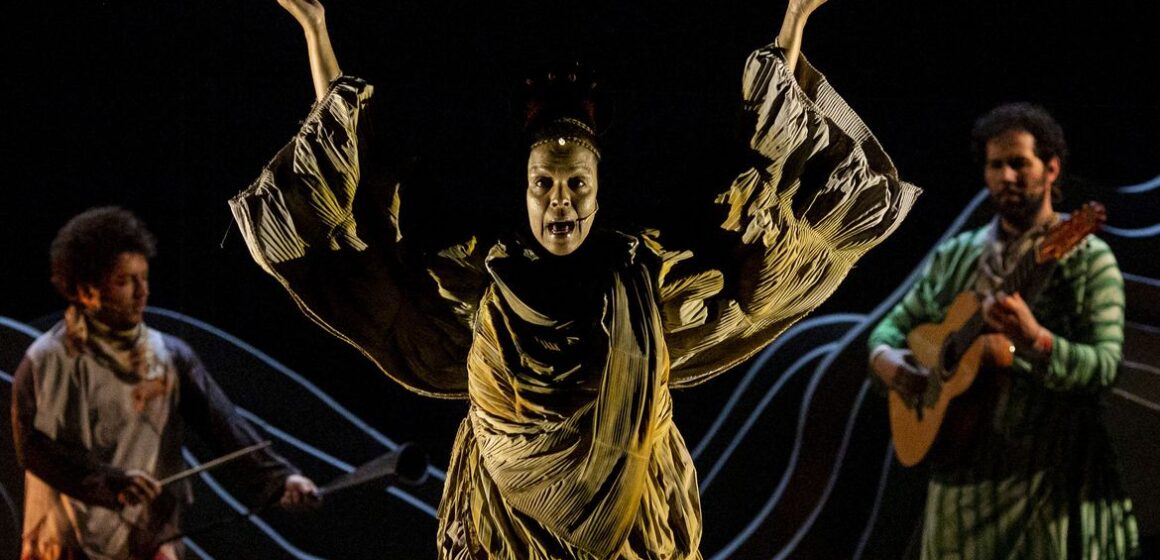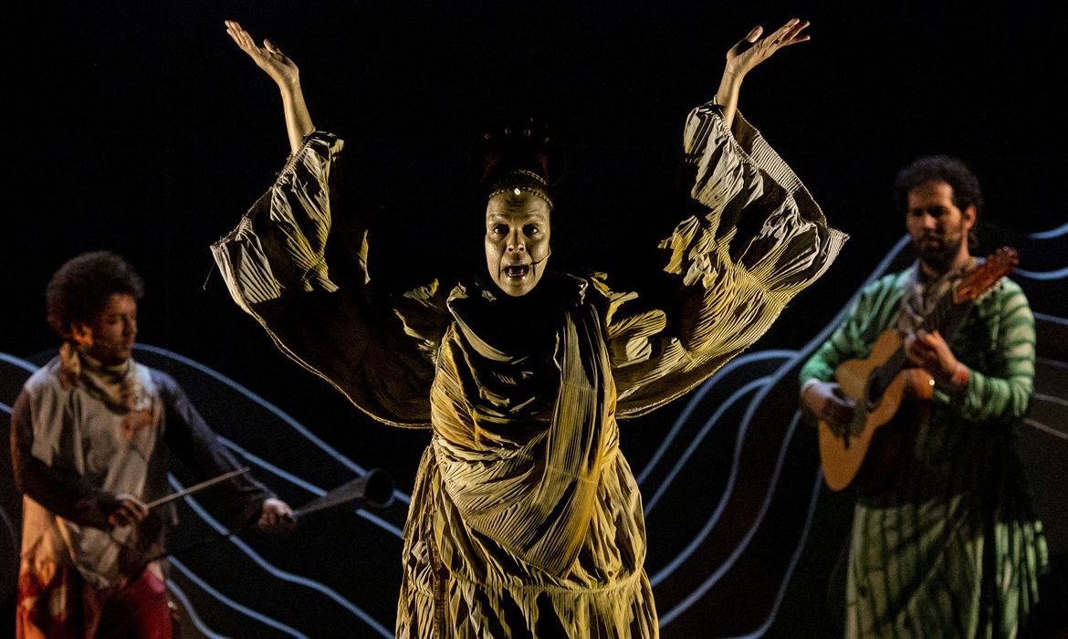 Atriz Ana Carbatti, dá vida à Luzia, nome dado ao fóssil humano mais antigo encontrado no Brasil, no musical Museu Nacional – Tomaz Silva/Agência Brasil