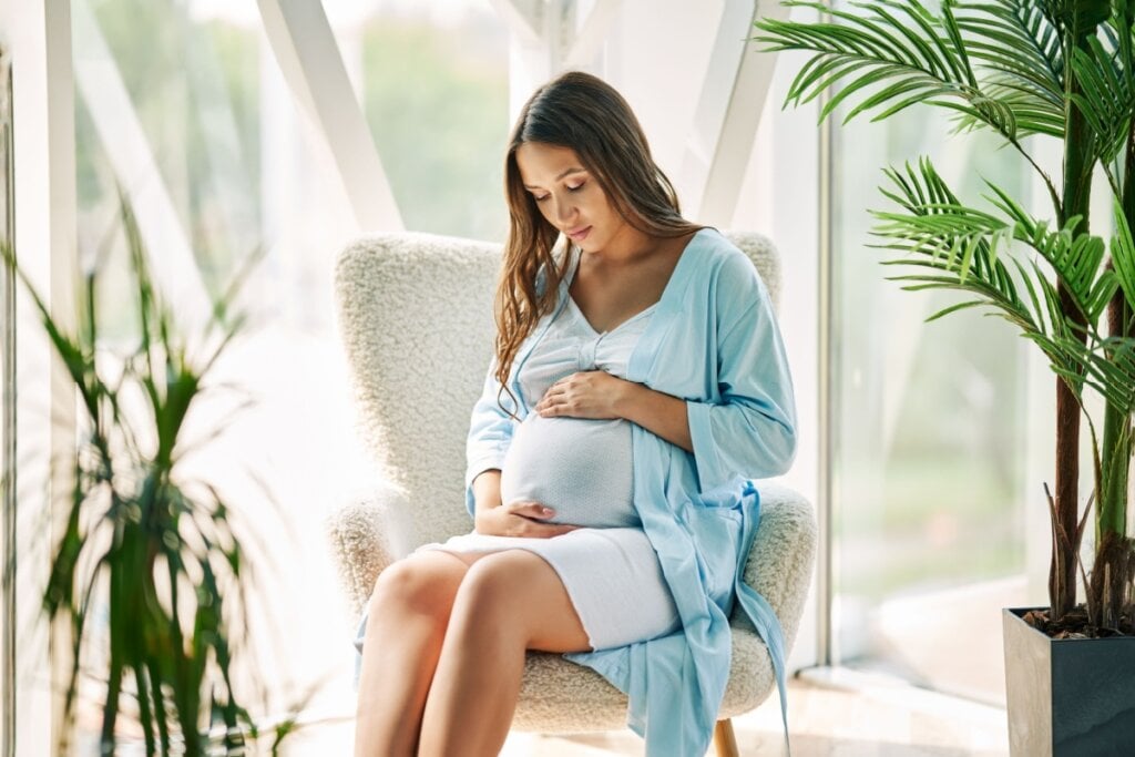 Mulher grávida sentada em sofá branco segurando a sua barriga