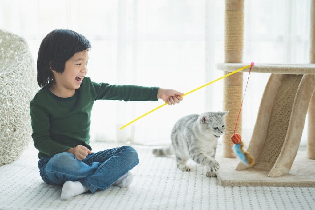 Menino sentado brincando com um gato com uma varinha
