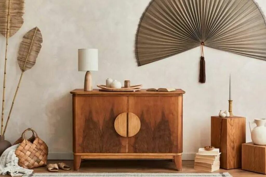 A designer de interiores Ana Paula de Almeida explica que os móveis que compõem a decoração japandi possuem um design simples e minimalista e são baixos, isto é, mais próximos ao chão. Além disso, matérias-primas naturais também ganham espaço. Por isso, é possível optar por mobiliários de madeira e fibras naturais, como vime e bambu. Segundo Bruna Del Frari, isso dá ao ambiente uma atmosfera mais natural.