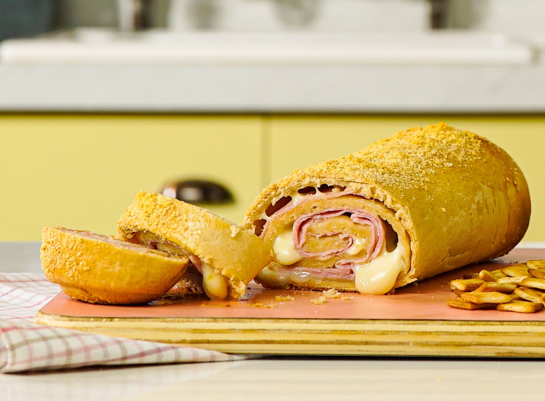 Sabe quando bate aquela vontade de comer um pão caseiro? O Pão de Presunto e Queijo é a escolha ideal. Com massa preparada com biscoito Presuntinho, recheio de presunto e muçarela e finalizada com uma cobertura crocante que dá ainda mais sabor a cada fatia, a receita combina praticidade e muito sabor.